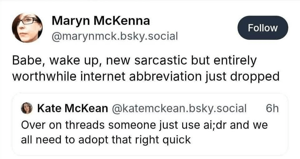 The typical tl;dr of too long; didn’t read is generally used by people to reduce a piece down into it’s essence or core. I find it ironic that ai;dr has been made as a way to show how ai attempts to also produce these reductions of art. It seems slightly comical. There’s a lot to say about this but I’ll save my AI speech for next Tuesday.