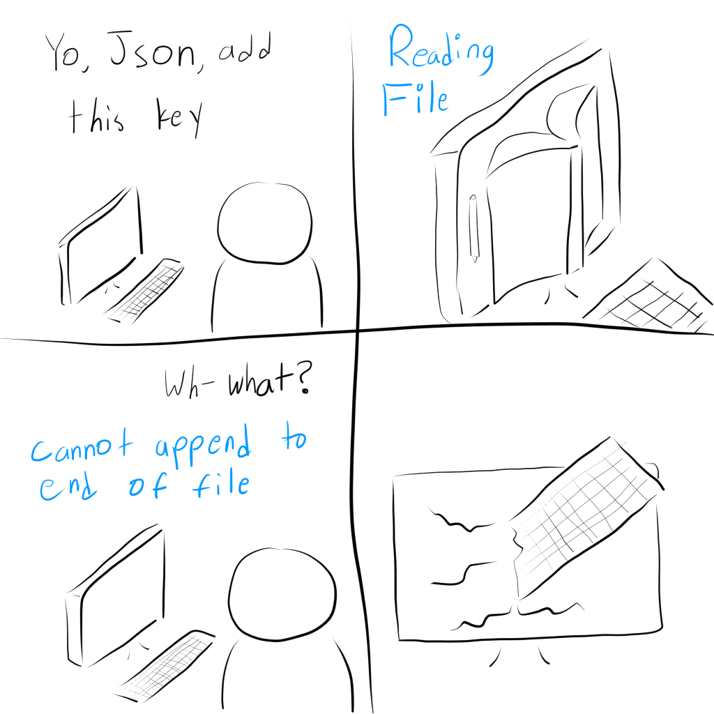 For some reason JSON needs a full read then write of the whole file to add stuff to the end of it. AHHHHHHHHHHHHHHHHHHHHHHHHHHH